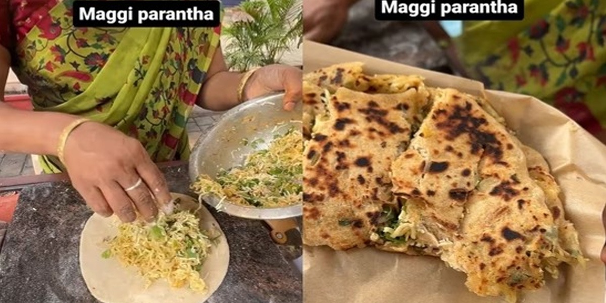 ویڈیو میں دیکھا جا سکتا ہےکہ ایک خاتون سڑک پر اپنے فوڈ ٹھیلے پر کھڑے ہوکر پراٹھا پکا رہی ہیں ، جس میں وہ کچھ اور نہیں بلکہ میگی بھررہی ہیں۔