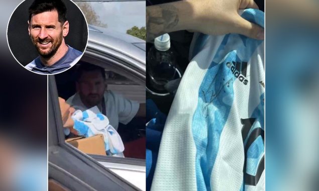 ایک مداح نے اپنی کار سے ارجنٹائن کی شرٹ لیونل میسی کی جانب پھینکی جسے کیچ کرتے ہی فٹبالر مارکرپین سے اس پر اپنے دستخط کرکے مداح کو خوش کردیا۔
