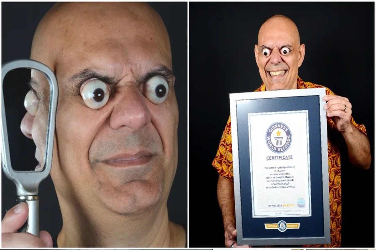برازیل سے تعلق رکھنے والے اس شخص کا نام سڈنی ڈی کاروالہو میسکویٹا ہے جوکہ کسی بھی تکلیف یا جدوجہد کے بغیر دیکھتے ہی دیکھتے دونوں آنکھوں کے ڈیلے 0.71 انچ تک باہر نکال سکتاہے۔