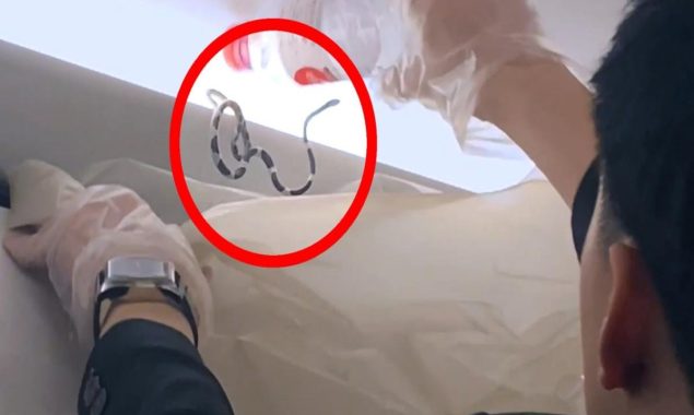 اس وائرل ویڈیو میں دیکھا جاسکتا ہے کہ فلائٹ انٹیننڈنٹ پہلے سانپ کو بوتل میں بند کرنے کی کوشش کرتا ہےتاہم چند ناکام کوششوں کے بعد وہ کپڑے کا تھیلا لایا اور اس کے اندر سانپ کو دھکیل کر قابو کر لیا۔