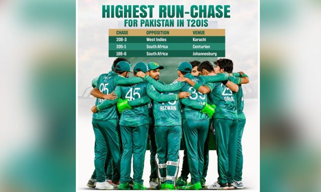 پاکستان ٹیم نے ٹی ٹوئنٹی کی تاریخ میں اپنا سب سے زیادہ ہدف حاصل کرنے کا نیا ریکارڈ قائم کرلیا ہے۔