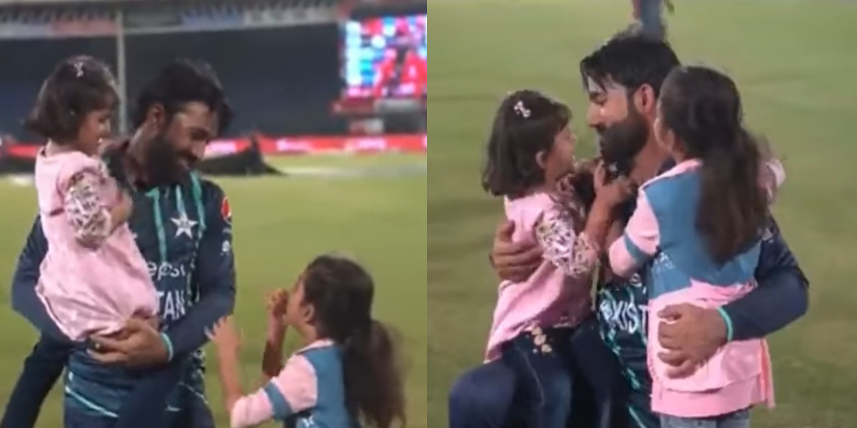 ویڈیو میں دیکھا جاسکتا ہے کہ محمد رضوان پوسٹ میچ کی تقریب کے وقت میدان میں موجود ہیں اور اچانک انکی دونوں بیٹیاں آتی ہیں اور انسے گلے ملتی ہیں۔