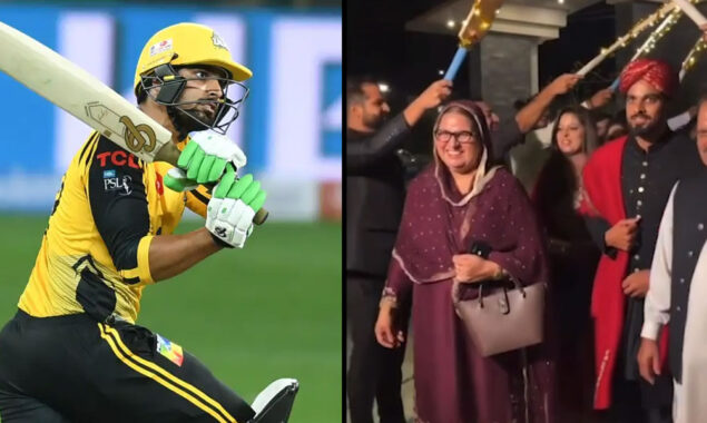 ویڈیو میں دیکھا جاسکتا ہے کہ عمر امین  اپنے والدین کے ساتھ روشنیوں سے سجے کرکٹ بیٹس کے سائے میں مسکراہٹیں بکھیرتے ہوئے انٹری کرتے نظر آتے ہیں۔