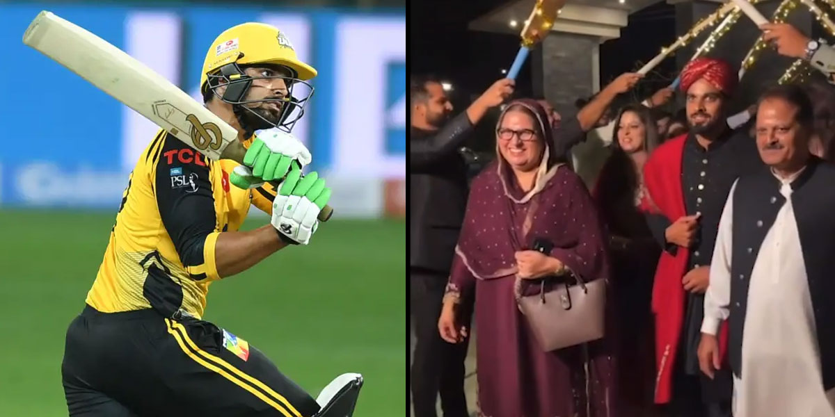 ویڈیو میں دیکھا جاسکتا ہے کہ عمر امین اپنے والدین کے ساتھ روشنیوں سے سجے کرکٹ بیٹس کے سائے میں مسکراہٹیں بکھیرتے ہوئے انٹری کرتے نظر آتے ہیں۔