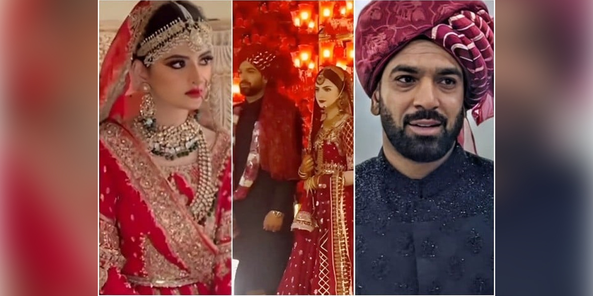 ویڈیو میں حارث کو بلیک شیروانی پر لال کلہ پہنے اور گلے میں پھولوں کی مالا پہنے جب کہ مزنا کو خوبصورت لال لہنگے میں دیکھا جاسکتا ہے۔