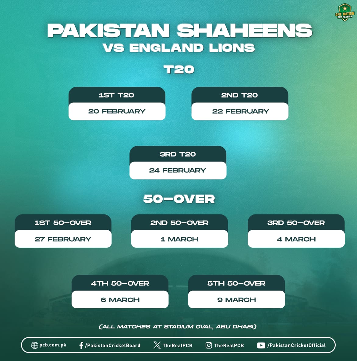 تمام میچز ابو ظہبی کے اسٹیڈیم اوول میں کھیلے جائیں گے۔ تین میچوں پر مشتمل ٹی ٹوئنٹی سیریز 20 فروری سے شروع ہوگی، جبکہ پانچ میچوں پر مشتمل ون ڈے سیریز 27 فروری سے 9 مارچ تک کھیلی جائے گی۔
