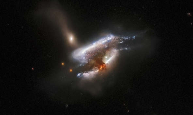 خلاء میں موجود ناسا کی ہبل اسپیس ٹیلی اسکوپ نے کروڑوں نوری سال کے فاصلے پر موجود تین کہکشاؤں کے تصادم کی زبردست تصویر کھینچی ہے۔