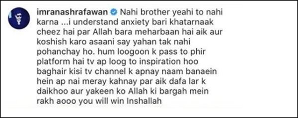 اداکار عمران اشرف نے یہ بھی کہا کہ آپ اس مقام تک ایسے ہی نہیں پہنچے ہو، اس کامیابی کے پیچھے آپ کی محنت ہے، درحقیقت ہمارے پاس تو ٹیلی ویژن کی صورت میں پلیٹ فارم ہے لیکن آپ تو لوگوں کے لئے مشعل راہ ہو کیوں کہ آپ نے بغیر کسی ٹی وی چینل کے نام بنایا ہے۔
