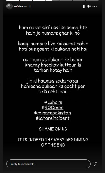 دوسری جانب پاکستانی اداکار محمد فیضان نے بھی انسٹاگرام پر لاہور کے واقعہ کے حوالے سے اپنے خیالات کا اظہار کیا ہے۔