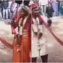 اس ویڈیو میں دیکھا جاسکتا ہے کہ عروسی لباس میں دلہن اور دلہا بے غم ہوکر اپنی شادی کی خوشیاں منانے میں مصروف ہیں جبکہ اردگرد لوگوں کا ہجوم لگا ہوا ہے۔