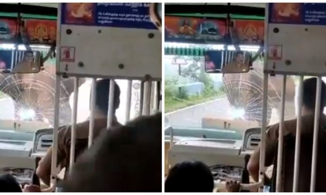 مذکورہ ویڈیو میں دیکھا جاسکتا ہے کہ ی سڑک پر اچانک ہاتھی نمودار ہوا اور بس پر حملے شروع کردیے، جانور نے اپنے سر کے وار سے بس کا شیشہ بھی توڑ دیا۔