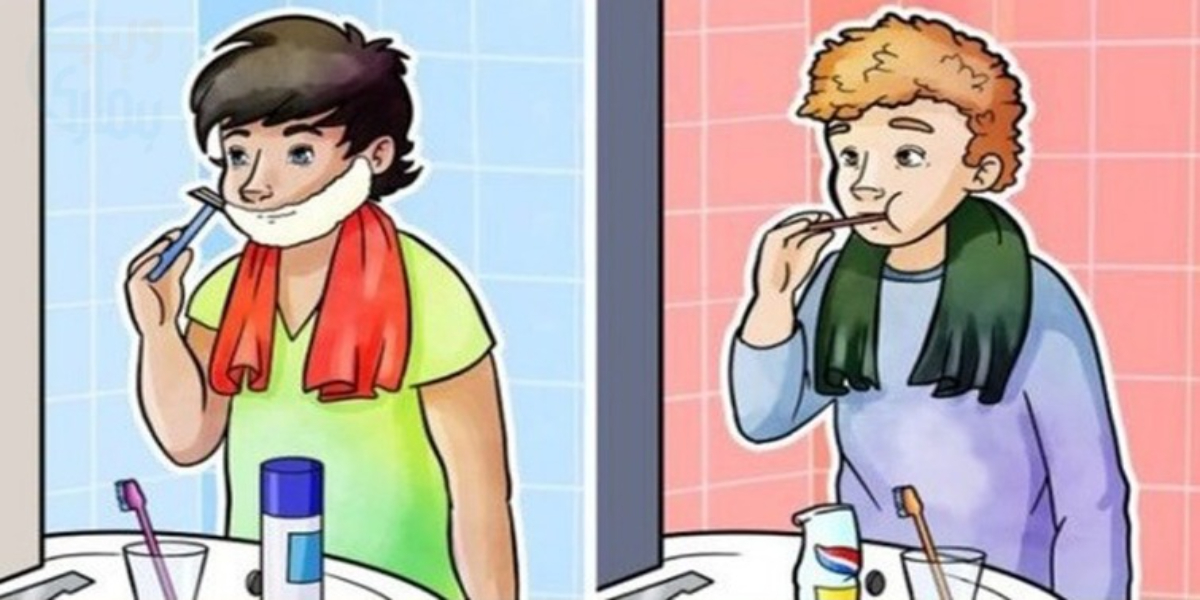 اوپر موجود تصویر میں آپ کو جواب تلاش کرنا ہیں جس میں دیکھا جا سکتا ہے کہ 2 لڑکے ہیں جن میں ایک دانتوں کو برش کر رہا ہے اور بائیں جانب والا لڑکا جو ہرے رنگ کی قمیض میں موجود ہے وہ شیو بنا رہا ہے۔