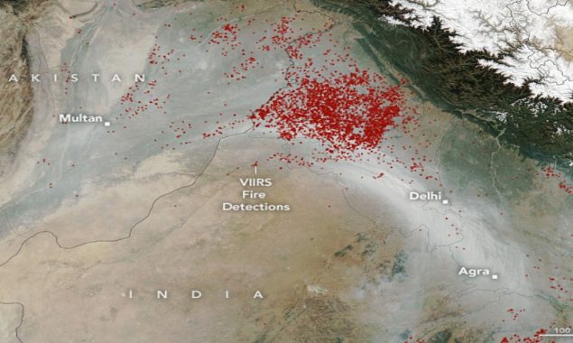 ناسا نے تصویر جاری کرتے ہوئے بتایا ہے کہ بھارت کے شمالی علاقوں میں لگی آگ کے دھوئیں نے دہلی کو لپیٹ میں لے لیا ہے جو کہ اسموگ میں اضافہ کر رہی ہے۔