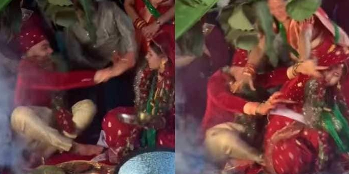 شادی کے منڈپ پر دلہا دلہن کو ایک دوسرے کے چہرے کو رنگنا تھا تاہم پہل کی کوشش میں دونوں کے درمیان جھگڑا شروع ہو جاتا ہے۔