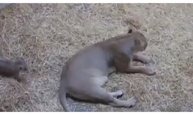 ویڈیو میں دیکھا جا سکتا ہے کہ شیرنی آرام کر رہی ہے اور اتنے میں شیر کا ایک بچہ پیچھے سے آکر اپنی ماں کو ڈرا دیتا ہے۔