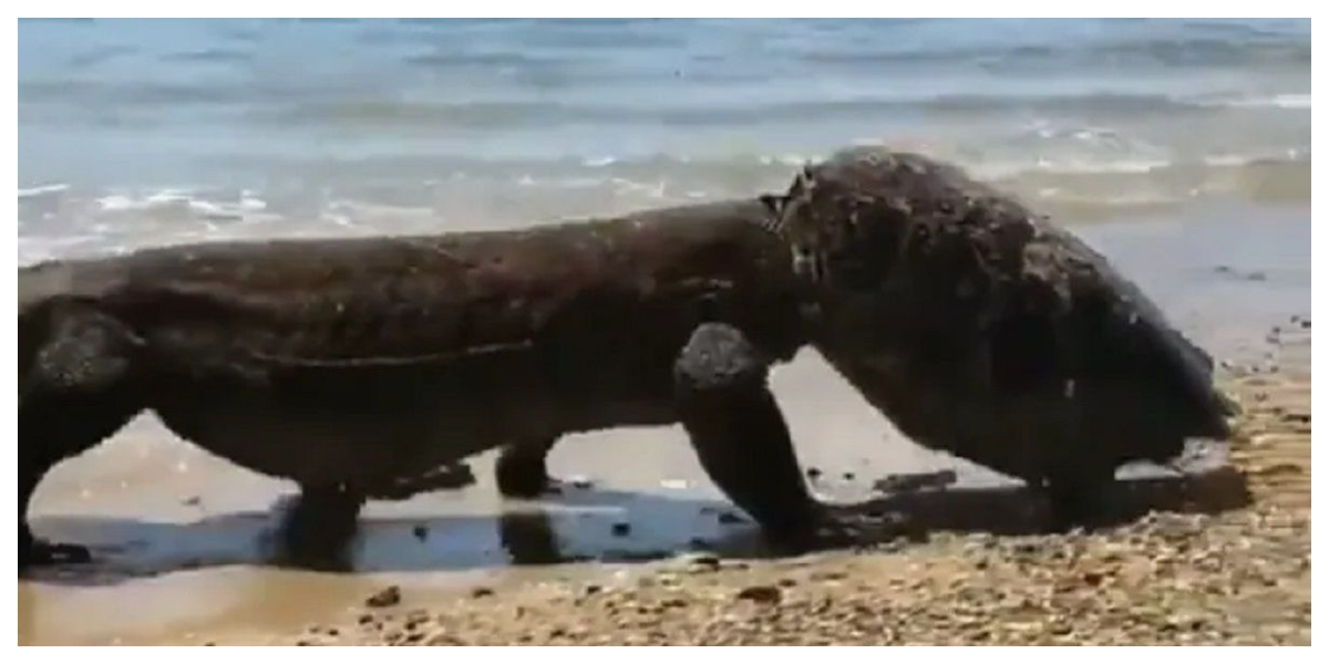 وائرل ہونے والی ویڈیو میں کوموڈو ڈریگن کو ساحل پر چہل قدمی کرتے ہوئے دیکھا جا سکتا ہے جہاں اس نے سر پر کچھوے کا خول سجایا ہوا ہے۔