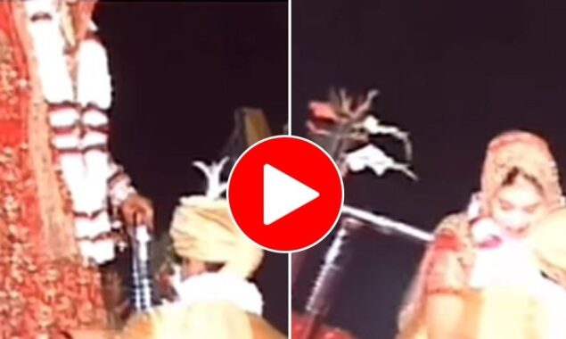 ویڈیو میں دیکھا جا سکتا ہے کہ ایک شادی ہال میں دلہن اسٹیج سے اُتر رہی ہے اور اچانک اسٹیج کے ٹوٹ جانے کی وجہ سے دلہن گرنے لگتی ہے۔