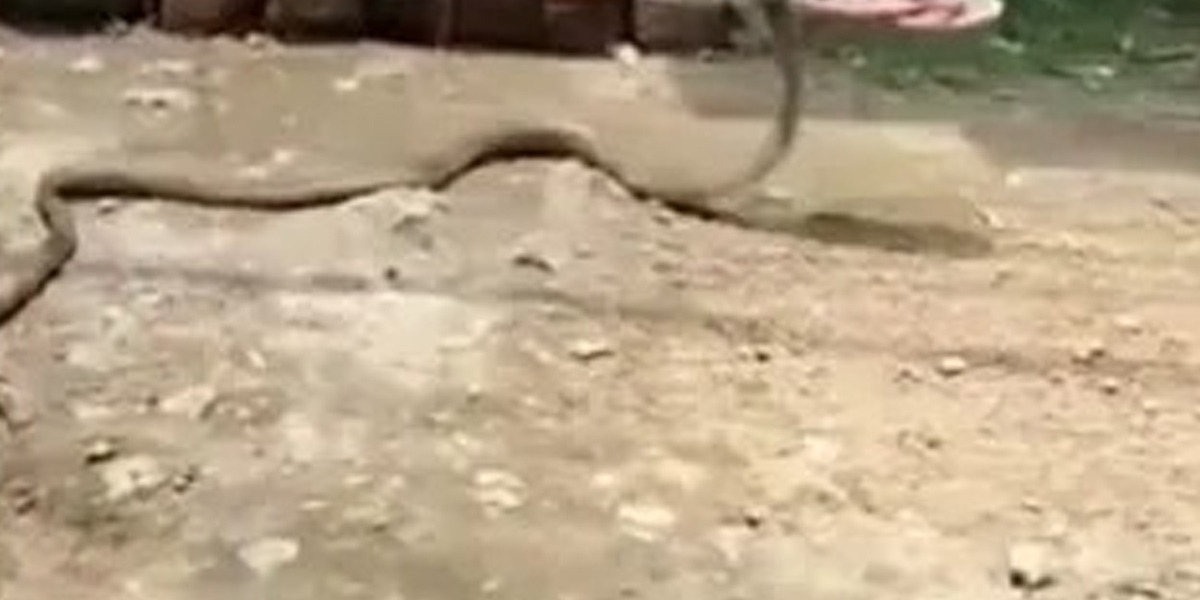 ویڈیو میں دیکھا جا سکتا ہے کہ سانپ چپل کی وجہ سے پسل جاتا ہے لیکن وہ فوراً خود کو سنبھالتا ہوا چپل کو منہ میں دبا کر ریگنے لگتا ہے۔
