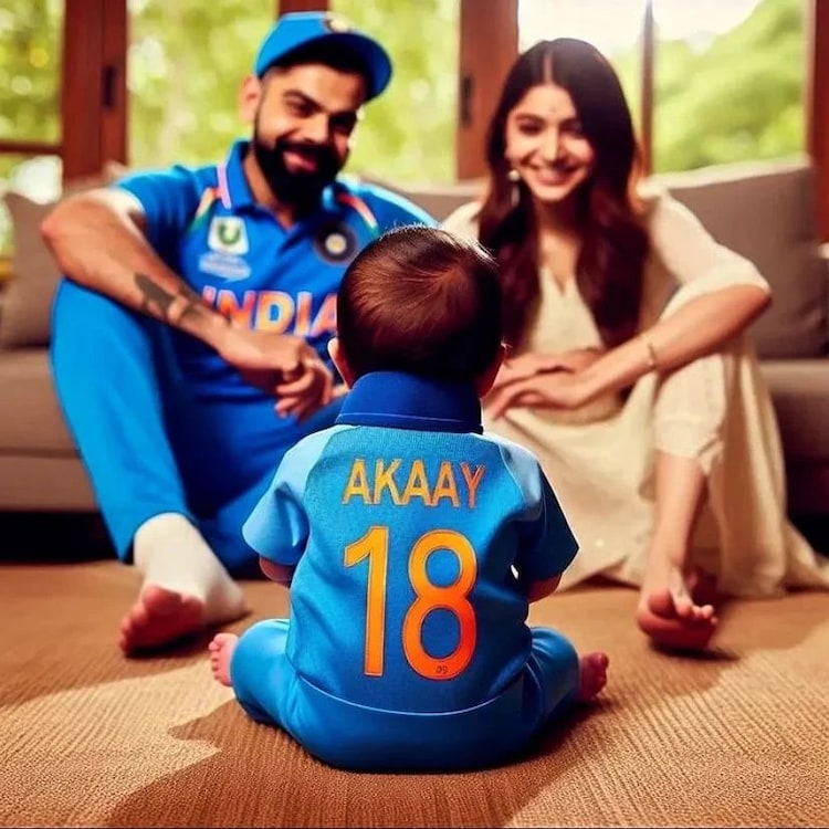 ان تصاویر میں ویرات اور انوشکا کو ایک دوسرے کے ساتھ بیٹھے ہوئے دیکھا جا سکتا ہے جب وہ اپنے نوزائیدہ، آکائے کو دیکھ رہے ہیں، جس نے 18 نمبر کی جرسی پہن رکھی تھی۔