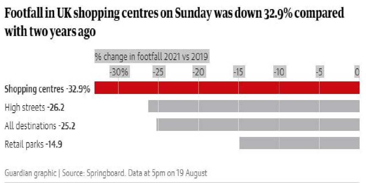 گزشتہ دو سال کے مقابلے میں برطانوی شاپنگ سینٹرز پر اتوار کے روز گاہکوں کی تعداد میں 32.9 فیصد کمی دیکھی گئی جس سے دو برس کے دوران کورونا کے باعث ہونے والے نقصان کا ازالہ سوچے بیٹھے دکانداروں کی بمپر دسمبر کمائی کی اُمیدوں پر پانی پھر گیا۔