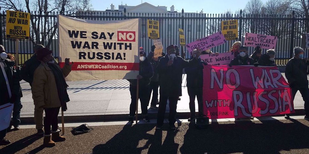 جنگ کے مخالف افراد نے وائٹ ہاؤس کے باہر ریلی بھی نکالی جس میں واشنگٹن پر زور دیا گیا کہ وہ روس کے ساتھ اپنے جنگی بیانات کو کم کرے اور امن اور سفارت کاری کے ذریعے مسئلہ حل کرے۔
