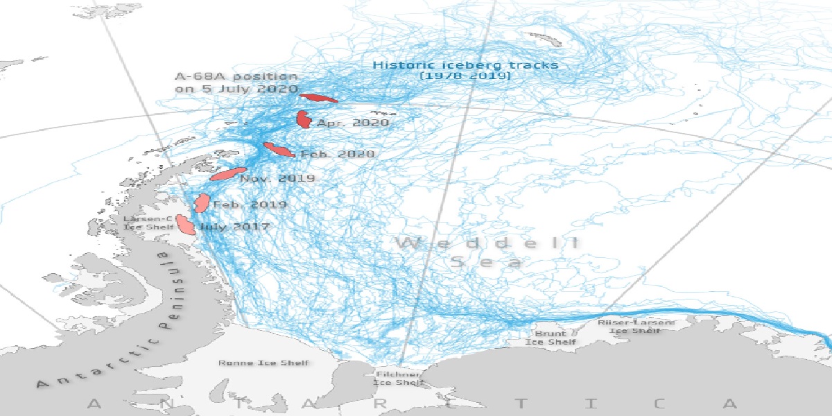 دیو ہیکل برفانی تودہ A68 جس کا رقبہ 6000 مربع کلومیٹر یا 2300 اسکوائر میل تھا، جولائی 2017ء میں انٹارکٹیکا (قطب جنوبی) سے ٹوٹ کر الگ ہوا تھا اور 2021ء تک اِس تودے کا نام و نشان بھی مٹ چکا تھا۔