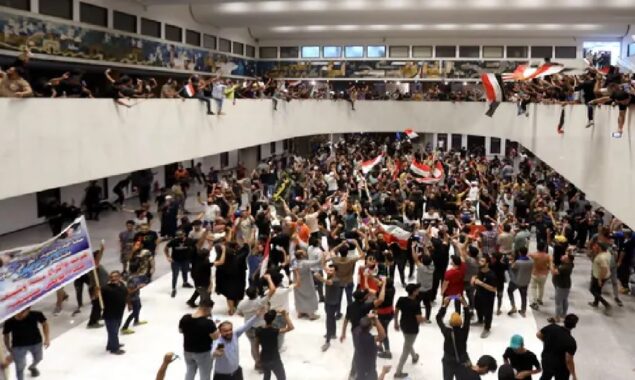 سینکڑوں مظاہرین دارالحکومت بغداد کے محفوظ ترین علاقے گرین زون کی رکاوٹوں کو توڑتے ہوئے پارلیمنٹ کی عمارت میں داخل ہو گئے تاہم اس وقت وہاں کوئی رکن موجود نہیں تھا۔ عراقی پارلیمنٹ کی عمارت سے متصل بہت اہم سیاسی اور سفارتی عمارتیں بھی واقع ہیں۔ نگراں وزیراعظم مصطفیٰ الکاظمی نے مظاہرین سے فوری طور پر وہاں سے نکل جانے کو کہا۔