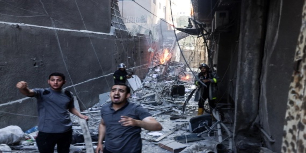 اسرائیلی طیاروں کی وحشیانہ بمباری کے بعد غزہ شہر میں فلسطین ٹاور کی ساتویں منزل سے دھواں نکلا۔ شہری دفاع کی ٹیمیں جائے وقوعہ پر پہنچ گئیں تاکہ لوگوں کو نکالا جائے اور حملے سے لگنے والی آگ پر قابو پالیا جائے۔