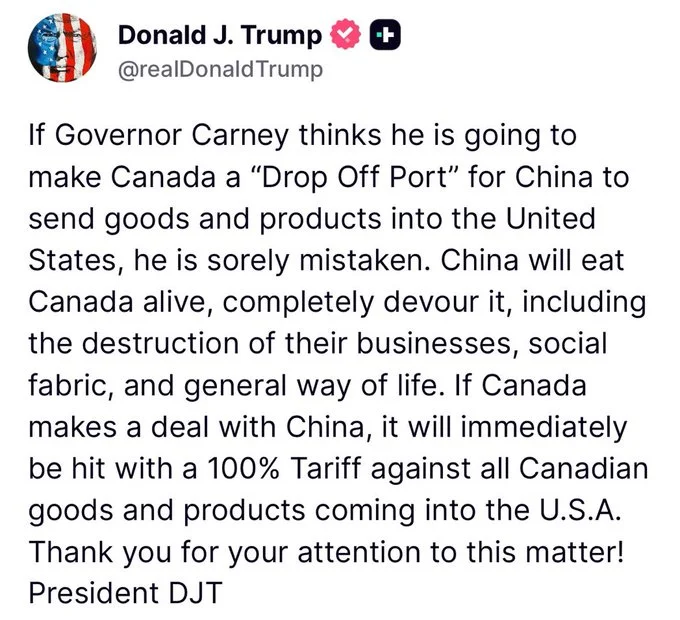 یہ بیان ڈونلڈ ٹرمپ نے ٹروتھ سوشل پر جاری کیا جس میں انہوں نے چین اور کینیڈا کے درمیان ممکنہ تجارتی تعلقات پر سخت خبردار کیا اور کہا کہ کینیڈا کے کاروباری اور سماجی ڈھانچے کو چین کی جانب سے نقصان پہنچنے کا خطرہ ہے۔