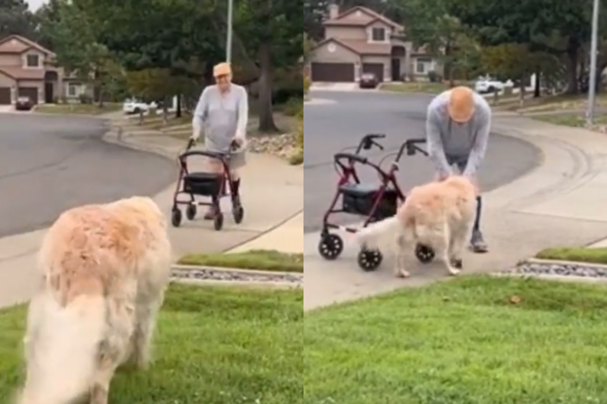 The post’s caption says, “Every morning 11-year-old dog Maisy is waiting for her 90-year-old friend Richard during his daily walk.”