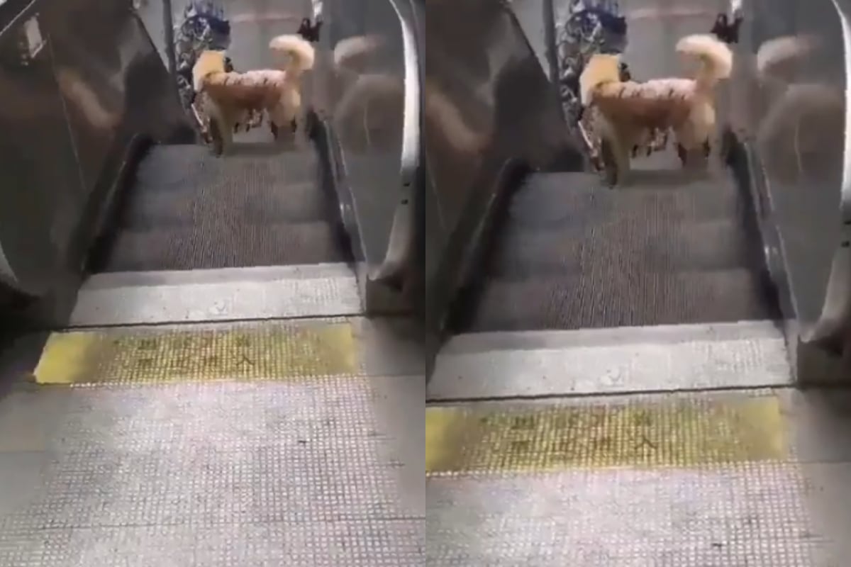 A street dog is seen in the footage ascending an escalator. When it reaches the end, it sprints to the stairwell next to the escalator, descends, and then returns to the escalator. This guy seems to enjoy going for rides a lot.
