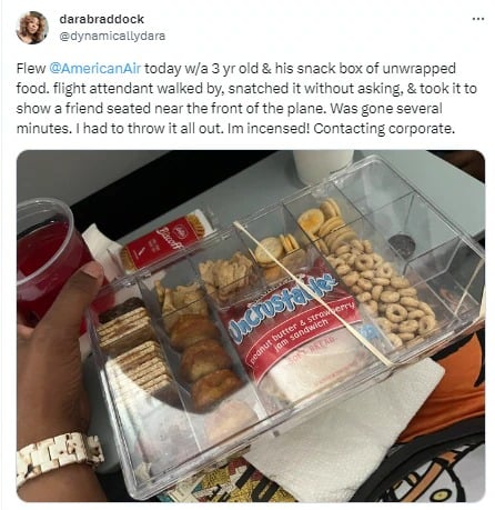 In her Twitter post, she recounted the experience, saying, “Today, during my flight with @AmericanAir, I had my three-year-old nephew’s tray with a selection of unwrapped snacks. A flight attendant passed by, took the tray without asking, and displayed it to a colleague towards the front of the aircraft. She was absent for quite some time.