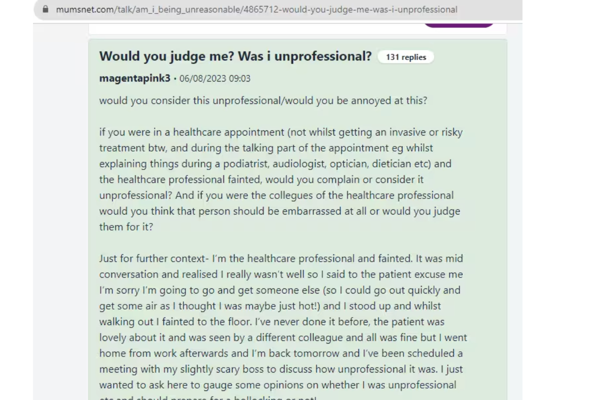 In the post, she wrote, “I’m a healthcare professional and fainted. It was mid-conversation, and I realized I wasn’t well. So, I said to the patient ‘Excuse me, I’m sorry, I’m going to go and get someone else’ (so I could go out quickly and get some air as I thought I was maybe just hot!) and I stood up, and while walking out, I fainted on the floor.” She further explained that the next day when she came in for work, she was scheduled for a meeting with a “slightly scary boss to discuss how unprofessional it was.”