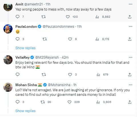 “Enjoy being relevant for a few days bro. You should thank India for that and btw Jai Hind,” another user wrote.