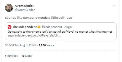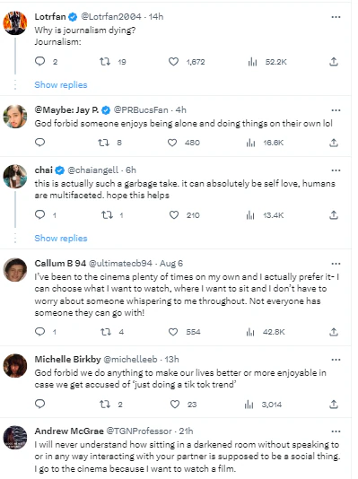 The article has raised eyebrows among those who enjoy solitary activities like going to the theatres alone, as it challenges the perception of such actions as acts of self-love.