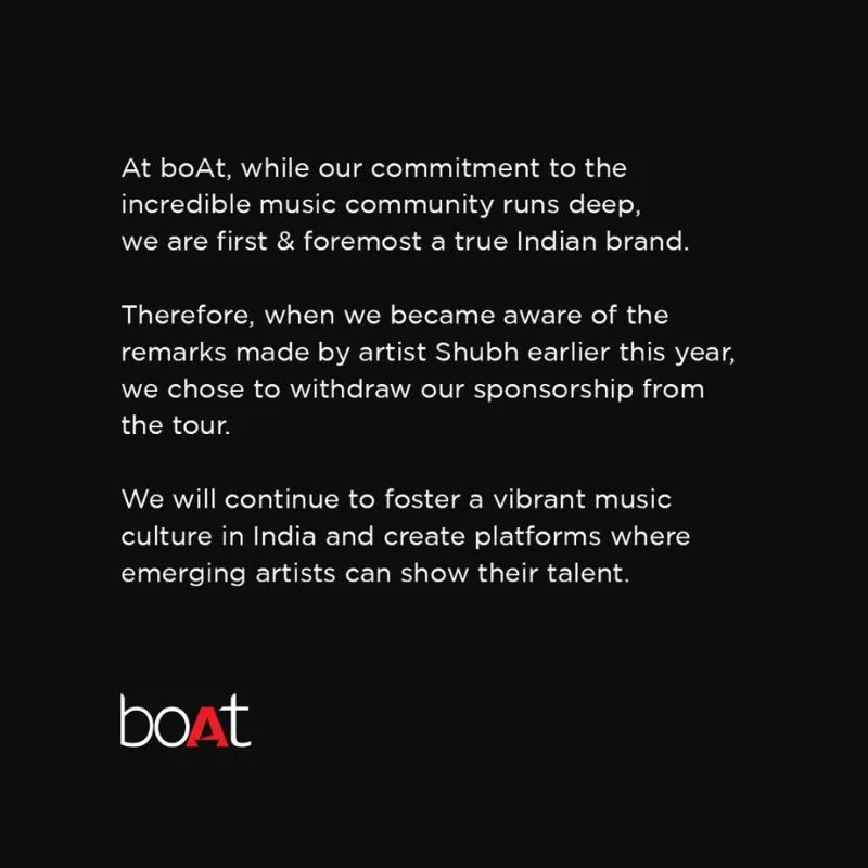 Due to the strong negative reaction, Boat decided to terminate its sponsorship agreement with Shubh on September 19. In their statement, Boat explained that they would no longer support Shubh’s Still Rollin India tour, emphasizing their identity as an authentic Indian brand. They cited Shubh’s earlier comments as the reason for their decision and announced it via a tweet.