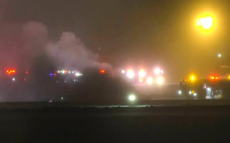 Air traffic control audio captured by CBS News and published by LiveATC.net recorded controllers and pilots discussing low visibility minutes before the crash. Shortly after, a controller reported seeing “a passenger aircraft upside down.” Photos from the scene showed smoke and flames on the runway.