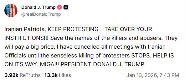 Trump further announced that all meetings with Iranian officials are suspended until the senseless killings of protesters cease.