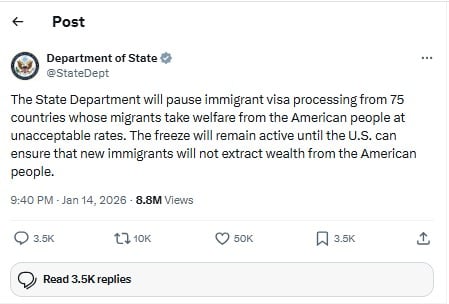 The visa suspension is set to begin on January 21. U.S. embassies have been instructed to deny visas under existing law while the State Department reassesses immigration procedures. No end date for the freeze was provided.